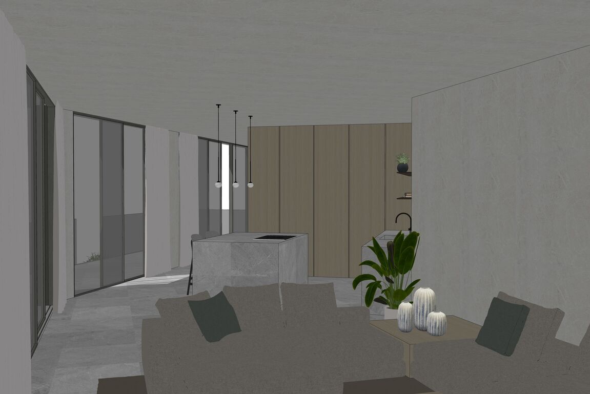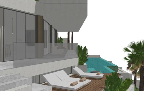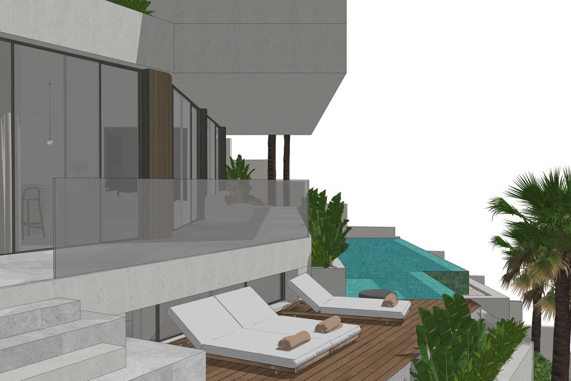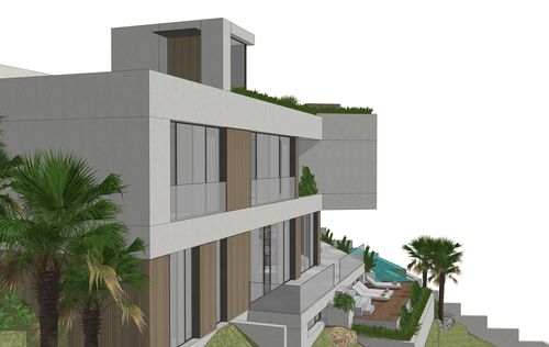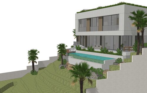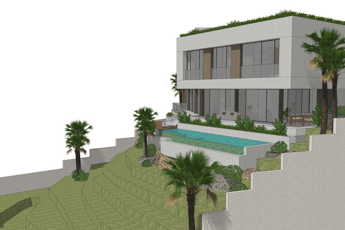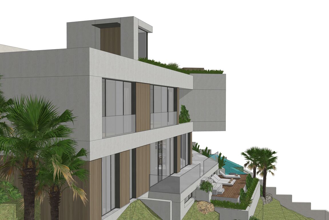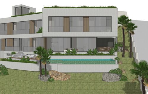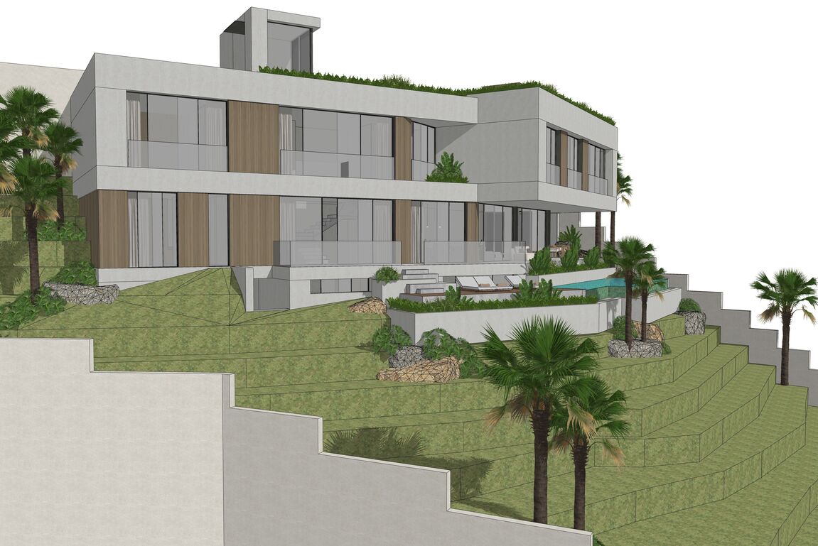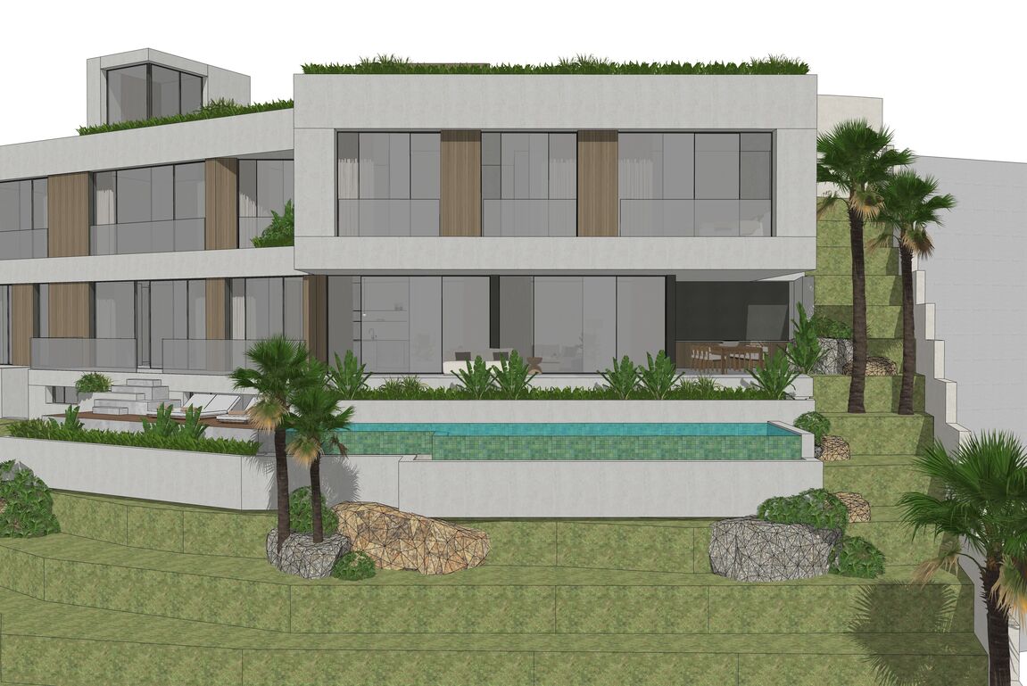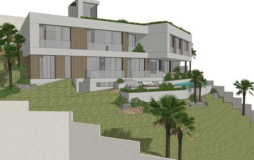 In Monport, one of the most sought-after and stable residential areas of Port Andratx, this exceptional building plot with valid building permit based on an approved plan is offered for sale. Quietly located, surrounded by mature nature and nestled in a high-quality neighborhood, it combines privacy, location quality, and architectural potential in a rare way. On a plot area of 1,149 m², it offers the opportunity to build a modern villa with a clear architectural signature—without having to go through a new approval process. The design by the renowned architectural firm Jaime Salvá Arquitectura & Interiorismo consistently follows the natural slope topography. Clear lines, green roof areas, spacious terraces, and expansive glass fronts create flowing transitions between interior and exterior spaces, allowing the surrounding landscape to become an integral part of the living concept. The plan is for a villa with a total area of 576.54 m², designed with five bedrooms and five en-suite bathrooms and a clearly structured spatial dramaturgy over several levels. An elevator conveniently connects all floors. Spacious terraces harmoniously extend the living space outdoors, while the infinity pool is positioned on the level below and blends in visually with the green surroundings. This creates an exciting architectural gradation that seamlessly connects the interior and exterior areas. The approximately 18-meter-wide facade with floor-to-ceiling windows emphasizes the light-flooded, open character of the house. Two parking spaces at street level complement the well-thought-out overall concept and combine design with everyday practicality. The west-facing orientation gives the property a special atmosphere. When the sun sinks behind the hills of Monport in the evening, it creates that warm, golden light that makes this part of the southwest so distinctive. At the same time, the port of Port Andratx with its restaurants, boutiques, and yachts, as well as all the infrastructure, is only a few minutes away. For years, Monport has stood for privacy, quality, and sustainable value development. Plots with valid licenses in this location are rare – especially when location, orientation, and architectural design come together in this way. It is the ideal foundation for a contemporary villa in the southwest of Mallorca – modern, private, light-flooded, and harmoniously embedded in the natural environment.