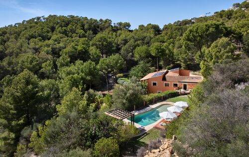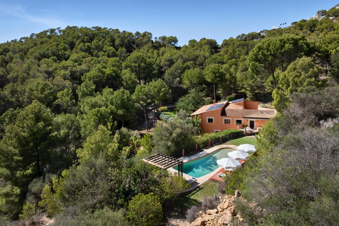 Nestled in the peaceful hills of Andratx, this impressive country estate offers a true sense of nature, privacy, and Mediterranean charm. A private driveway meanders through the estate’s own forest and natural landscape, leading to the main house, surrounded by pine trees and open countryside views. The property extends over approximately 60,000 m² and offers total tranquility, yet is located just a few minutes from the harbor of Puerto Andratx. The estate also benefits from a holiday rental license, making it an excellent investment opportunity as well as a private retreat. The main residence is spread over two floors with a total built area of approximately 530 m², of which around 455 m² correspond to living space. On the main floor, a generous entrance hall welcomes you, leading to a bright and spacious living and dining area with high ceilings, wooden beams, and a fireplace — creating a warm and elegant atmosphere. From here, you step out onto a large covered terrace overlooking the gardens and surrounding greenery. On this level there is also a fully equipped kitchen with direct access to the outdoor area and pool, as well as a large master suite with a private lounge, en-suite bathroom, and glazed terrace. On the lower level, three additional bedrooms — each with an en-suite bathroom — open directly onto the garden. The outdoor area features a large swimming pool (approx. 72 m²), sun terraces, and various relaxing corners surrounded by nature. A guest house and garage complete this exceptional property. This stunning property, set on an expansive plot of approximately 60,000 m², offers complete privacy and a serene setting with its own private forest, while being just minutes from Puerto Andratx. The residence boasts a living area of around 455 m² and a total constructed area of approximately 530 m², featuring four bedrooms, four bathrooms, and a charming guest house. Designed for comfort and modern living, it includes a fireplace, solar panels, garage, and a swimming pool, making it an exceptional retreat that combines natural beauty with luxury amenities. This finca is ideal for those seeking peace, authenticity, and a deep connection with nature — all within close reach of the exclusive port of Andratx.