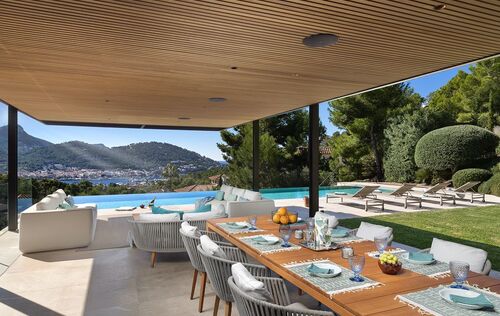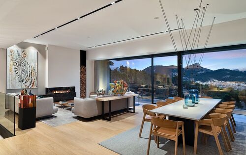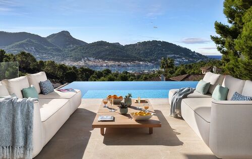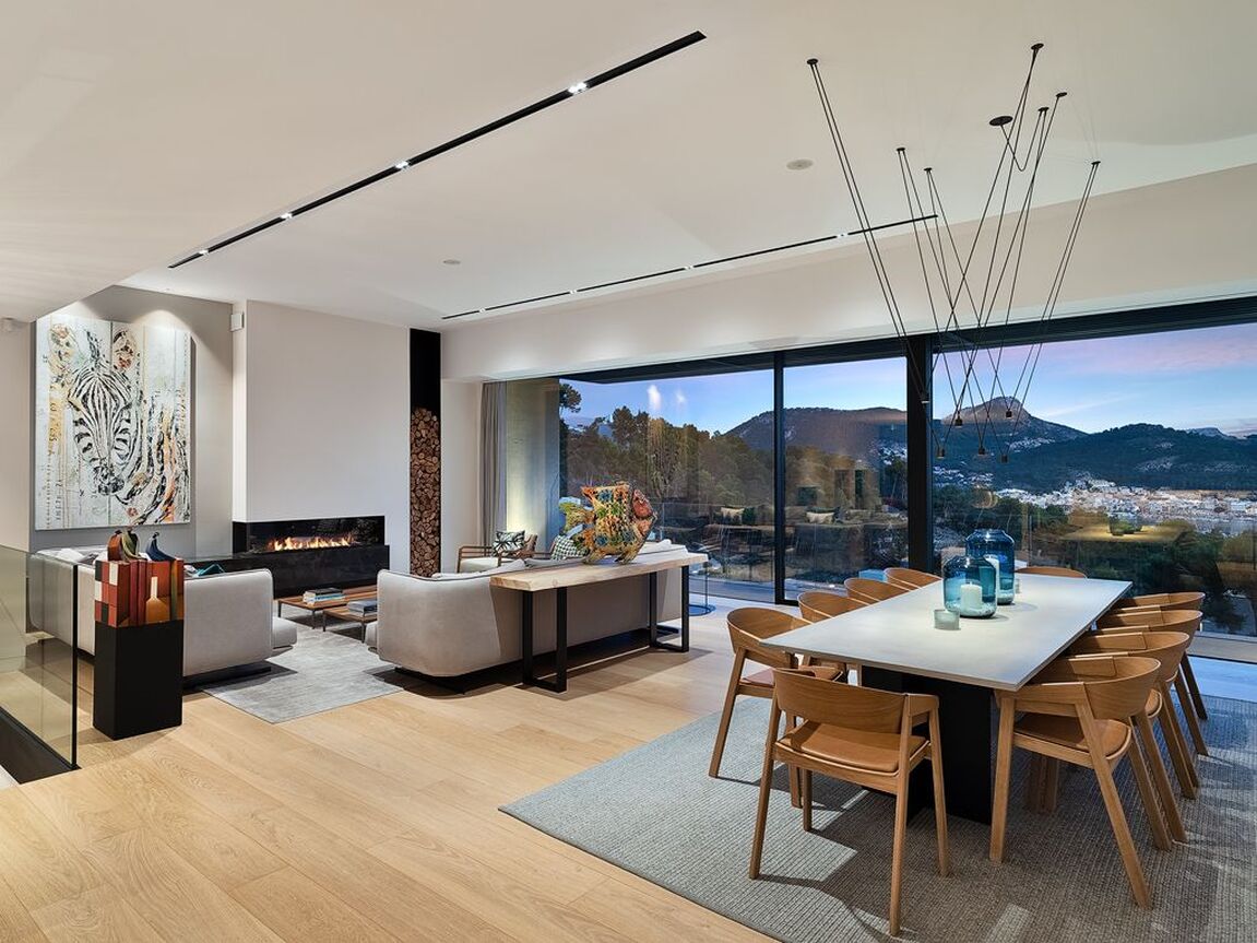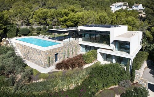 Denna moderna villa, i exklusivitet med Engel & Völkers Port Andratx, ligger i en pittoresk miljö och erbjuder en oöverträffad reträtt i närheten av den naturliga hamnen i Port Andratx, den framstående fiske- och segelbåtshamnen, i den populära sydvästra delen av Mallorca. Premiumvillan ligger på en kulle och har en fantastisk panoramautsikt över hamnen, Medelhavet och de idylliska omgivningarna. Villan i sig är ett mästerverk av arkitektonisk briljans, sömlöst kombinerar modern elegans och medelhavscharm. Varje aspekt av villan har noggrant utformats för att erbjuda det yttersta inom komfort och sofistikering, vilket skapar en oas av lugn. De rymliga och smakfullt inredda vardagsrummen är möblerade med möbler av hög kvalitet och prydda med eleganta accenter som skapar en atmosfär av raffinerad lyx. Villan har en öppen planlösning som enkelt kombinerar inomhus- och utomhusutrymmen. Stora fönster och skjutbara glasdörrar gör att naturligt ljus strömmar in i rummen samtidigt som det ger sömlös tillgång till den expansiva täckta terrassen med intilliggande platt gräsmatta. Här kan du sola i Medelhavssolen, koppla av vid infinitypoolen eller äta middag utomhus medan du fascineras av den spektakulära utsikten. Det intilliggande grönområdet ger huset ytterligare avskildhet och lugn. Den moderna villan har totalt sex fullt utrustade sovrum med eget badrum, alla omsorgsfullt utformade för att skapa en fridfull tillflyktsort. Master-sviten med egen balkong är en privat tillflyktsort med vacker utsikt över hamnen. För dem som söker underhållning och avkoppling erbjuder villan en rad imponerande bekvämligheter. Ett fullt utrustat modernt kök från Bulthaup inbjuder till kulinariska äventyr. Ett privat och fullt utrustat gym gör det möjligt för de boende att upprätthålla sin fitnessrutin. Port Andratx med sina utsökta butiker, restauranger och vackra strandpromenad ligger inom bekvämt gångavstånd. Andra funktioner i denna fantastiska fastighet inkluderar: Designer utomhuskök, inomhus- och utomhus SONOS-system inklusive trädgården, fiberoptisk internetuppkoppling med förstärkare i hela huset, uppvärmd utomhuspool, BUS-system, inomhus / utomhus säkerhetssystem med ytterligare 7 kameror, dubbelgarage och mycket mer.