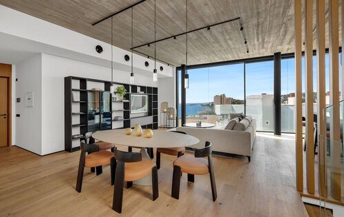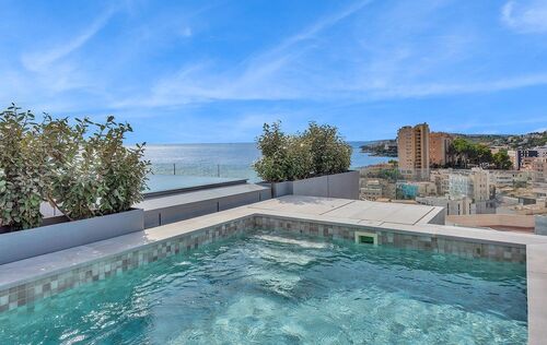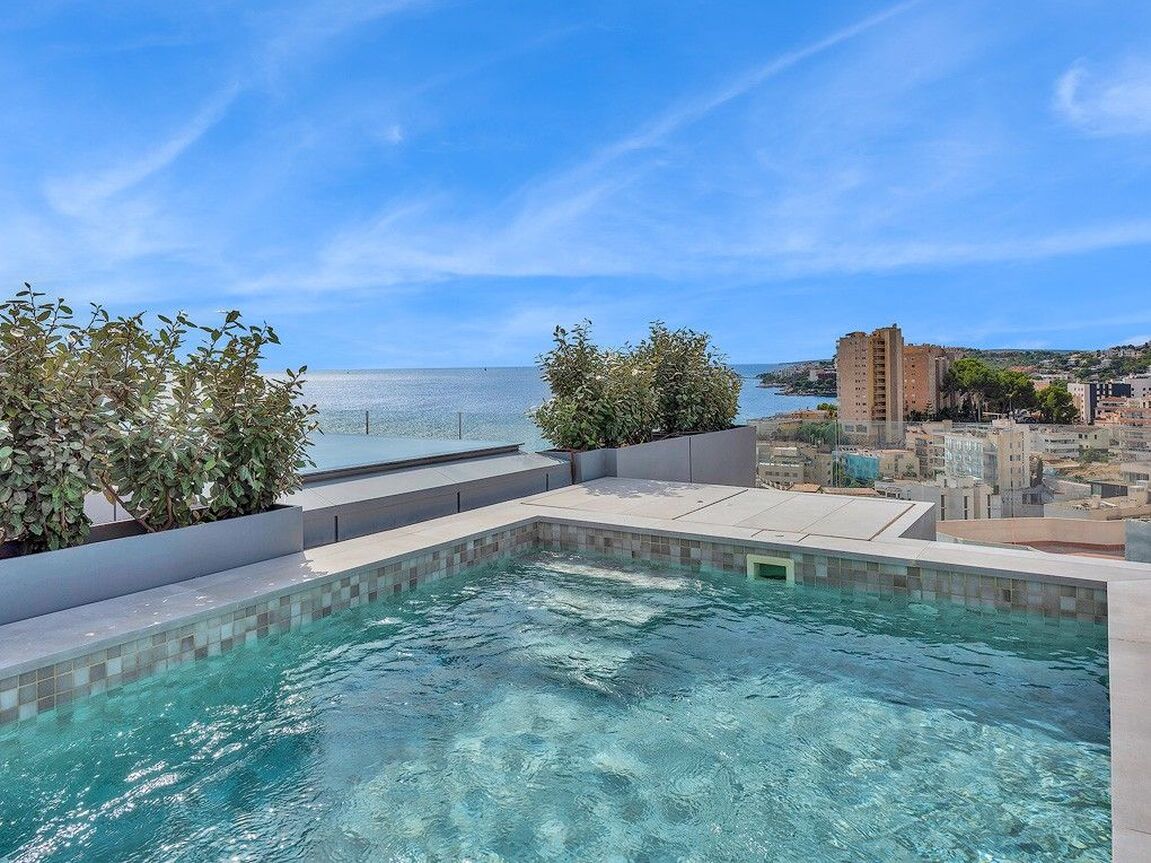 På gångavstånd till den vackra fina sandstranden Cala Mayor och bara ett stenkast från centrum av öns huvudstad Palma färdigställdes nyligen det lilla, exklusiva nya bostadskomplexet MIRADOR. De totalt 7 högkvalitativa lägenheterna med 3-5 sovrum har alla en terrass med privat pool och för det mesta havsutsikt. Takvåningarna i duplex med privata takterrasser erbjuder en hisnande utsikt över hela Cala Mayor-bukten. Byggnadens arkitektur med stora glasfasader och gabionmurar av lokal sten är innovativ och imponerande, vilket gör MIRADOR till en arkitektonisk höjdpunkt på sydvästra Mallorca. Stor vikt har lagts vid komfort, kvalitet och design i lägenhetsinredningen. Alla lägenheter har rymliga vardagsrum och matplatser med öppen planlösning, moderna integrerade kök utrustade med Miele-apparater, stora Cortizo-fönsterfronter med aluminiumluckor i lägenheterna och motoriserade aluminiumpersienner i takvåningarna. Lägenheterna har hamrade naturstensgolv i vardagsrummen, medan takvåningarna och alla sovrum har ekparkettgolv. Det finns också ekdörrar från golv till tak, moderna badrum med Iconico-armaturer och Duravit-keramik, en fullt utrustad tvättstuga och KNX-teknik för hemautomation. Luftkonditionering (varm/kall) och golvvärme garanterar komfort året runt. Till komplexet hör också en hiss och ett rymligt underjordiskt garage med bilhiss. MIRADOR erbjuder dig mycket komfort, modern design, enastående arkitektur och fantastisk havsutsikt i ett lugnt läge nära både staden och stranden.