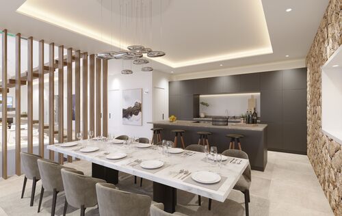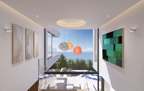 Välkommen till lyxresidenset "Oceanview" i Nova Santa Ponsa, ett eftertraktat område på sydvästra Mallorca. Denna villa imponerar med sitt förstklassiga läge, exklusiva inredning och tidlösa elegans. Den hisnande panoramautsikten över Medelhavet och hamnen i Port Adriano har gett villan dess namn "Oceanview". Från din terrass kan du njuta av spektakulära solnedgångar och titta på lyxiga yachter i hamnen. Invändigt kan du förvänta dig högsta kvalitet med naturstensgolv för tidlös elegans och parkettgolv i sovrummen för värme och komfort. De generöst tilltagna rummen erbjuder gott om utrymme för avkoppling och underhållning. Den privata infinitypoolen med omgivande terrass och medelhavsträdgård är utan tvekan en höjdpunkt och erbjuder den perfekta förfriskningen under varma dagar. Det rymliga köket är utrustat med högkvalitativa Gaggenau-apparater och är perfekt för amatörkockar. Njut av dina kulinariska mästerverk i matsalen eller på terrassen med havsutsikt. Villan har toppmoderna bekvämligheter som luftkonditionering och golvvärme för det perfekta inomhusklimatet året runt. Den smarta domotik-appen låter dig styra ditt hem var som helst, vilket tar komfort och säkerhet till en ny nivå. Källaren erbjuder ytterligare utrymme för dina behov, vare sig det är ett gym, biorum eller vinkällare. Tre parkeringsplatser och ett rymligt garage finns tillgängliga. En hiss ger enkel tillgång till alla våningar. De skräddarsydda inbyggda garderoberna i sovrummen ger gott om förvaringsutrymme och betonar den eleganta designen. Denna lyxvilla i Nova Santa Ponsa kombinerar lyxiga funktioner, hisnande havsutsikt och ett utmärkt läge. Med moderna bekvämligheter, rymlig interiör och elegant estetik är det den perfekta tillflyktsorten för kräsna köpare som letar efter en exklusiv fastighet på Mallorca. Läget erbjuder förstklassig tillgång till lokala bekvämligheter, golfbanor och stränder, bara en kort bilresa från Palma de Mallorca. Missa inte chansen att äga din egen bit av paradiset i Nova Santa Ponsa. Kontakta oss idag för mer information - färdigställandet av denna drömvilla förväntas ske sommaren 2025.